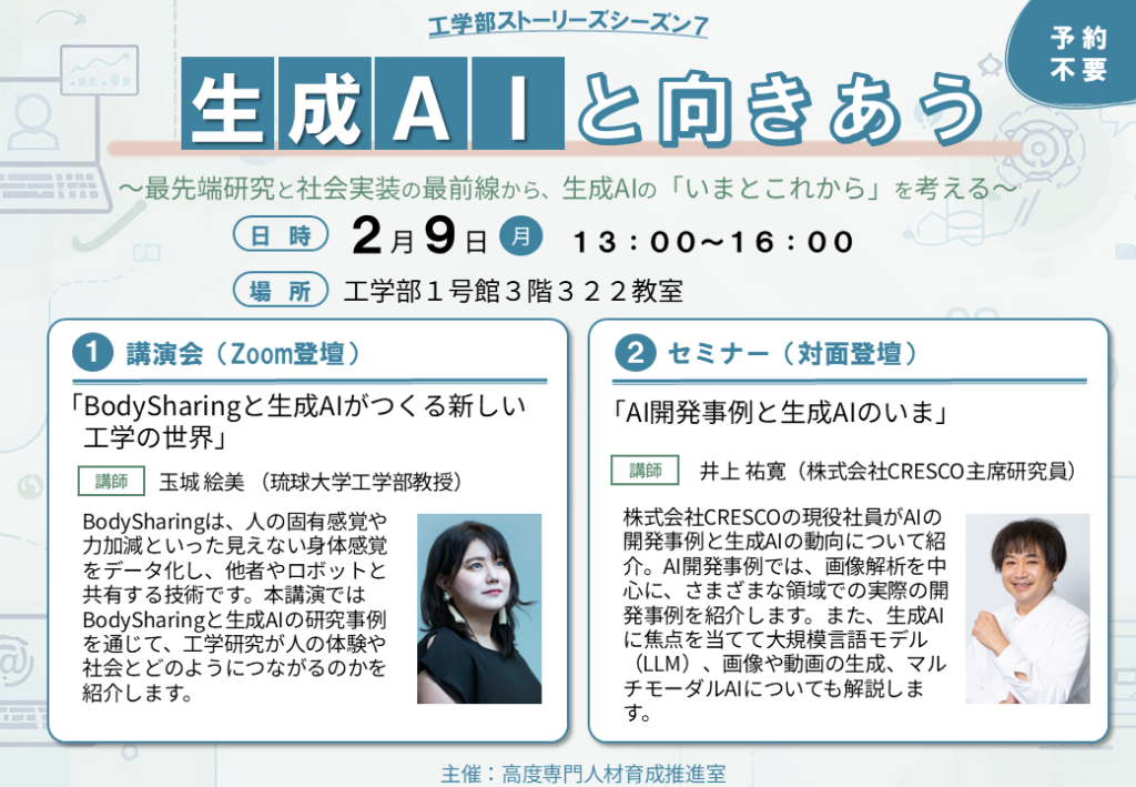 BodySharing研究で知られる玉城絵美教授による講演と、株式会社CRESCOの井上祐寛主席研究員によるセミナーを通じて、生成AIの「いま」と「これから」を考えます。工学・AIに関心のある学生・教職員の皆さまの参加をお待ちしています(予約不要)。