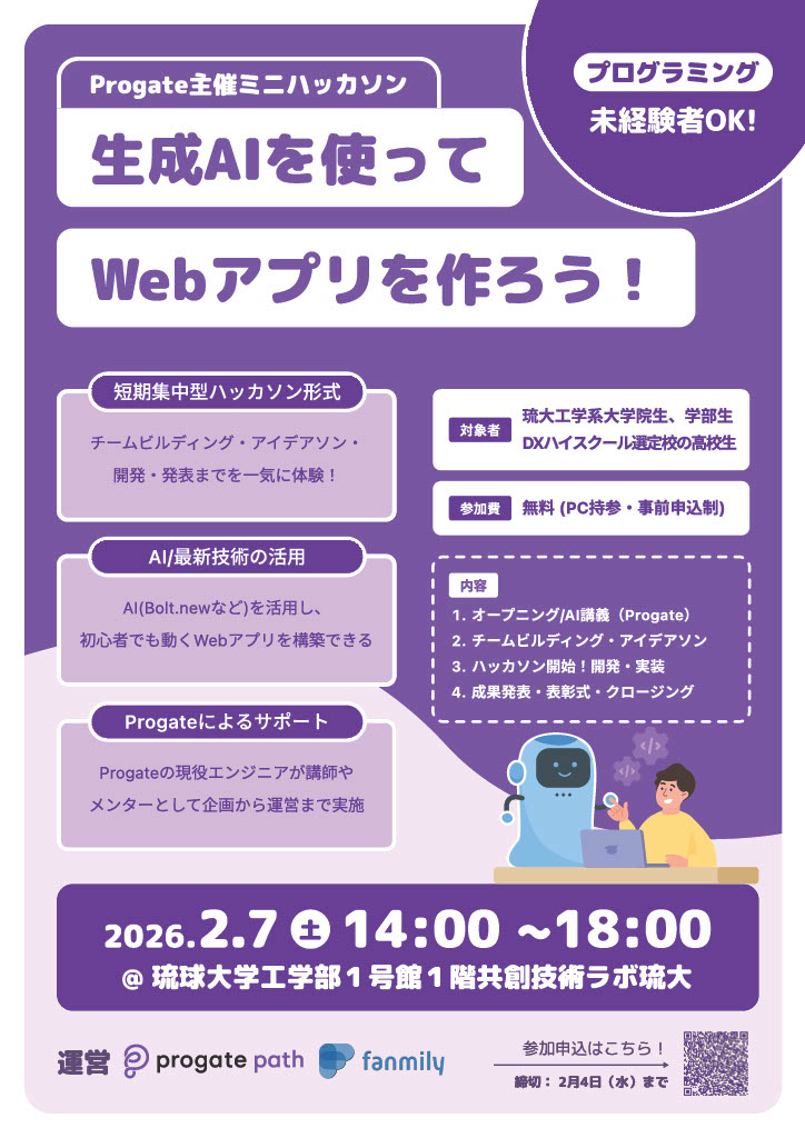 AI時代の新しい学び方を体験できるミニハッカソンを開催!生成AIを使ってWebアプリを開発し、短時間でアイデアを形にします。株式会社Progateの現役エンジニアのサポート付で、高校生の初心者から大学院生の経験者まで楽しめる内容です。企業×高校×大学の高大・産学連携イベントで、最新技術を学びませんか?